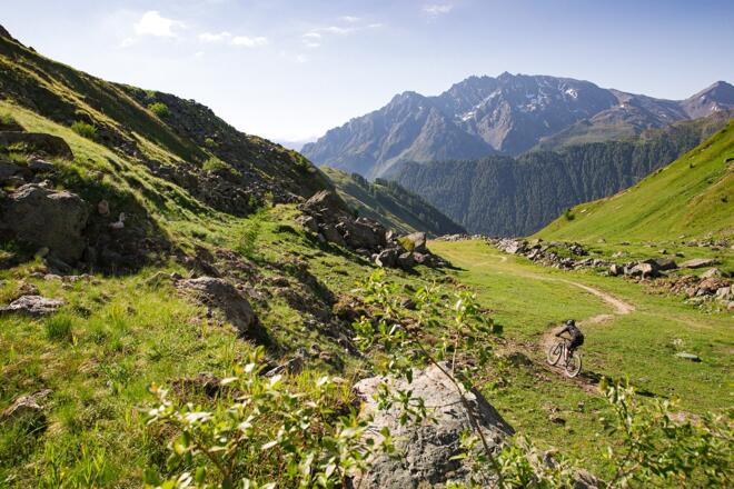 Diese Tour ist nichts für Weichwaden, sondern etwas für Leidensfähige oder E-Bike-Explorer. Los geht es in Samnaun Dorf. Man fährt auf breiten Schotterstrassen und muss einige bissige Rampen bezwingen. Im Winter geht hier die Skipiste „Duty Free Run“ durch. Nach dem Zeblasjoch beginnt ein Singletrail – und jetzt wird es erst richtig steil. Hut ab, wer hier ohne E-Bike alles durchtreten kann. Nach dem Paliner Kopf wird es wieder einfacher und es geht entlang des Grenzgrats bis zum Viderjoch. Pausen einlegen nicht vergessen, um die grandiosen Panoramablicke zu geniessen! Hinunter nach Samnaun-Laret geht es über die von Claudio Caluori gebauten Enduro- und Freeridetrails (Nr. 697) – Flowgenuss pur.