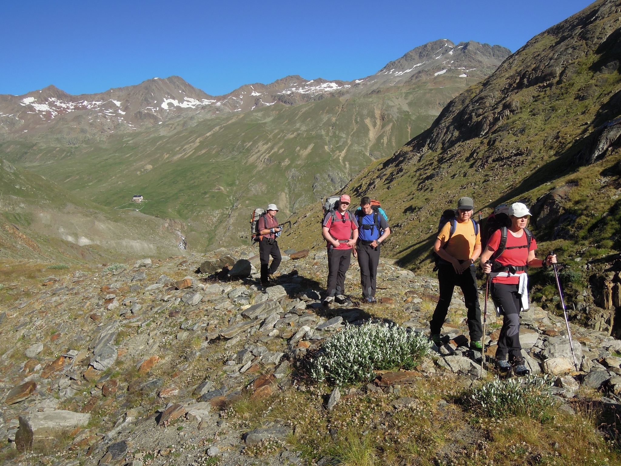 Etwas weiter unten sieht man wieder die Folgen des Klimawandels. Der massive Volumenschwund des Gurgler Ferners sorgt für immer mehr Instabilität der Berghänge oberhalb seines Randes. So gibt es auch just hier, wo jahrzehntelang der Weg verlief, ein riesiges durch Bergsturz gefährdetes Gebiet. Eine zwei bis drei Meter breite Spalte zieht sich durch den Fels, und direkt oberhalb davon geht der neu angelegte Umweg weiträumig daran entlang. So erreichen wir den großen Gletscher erst einige hundert Meter weiter nördlich als früher üblich. Der nach der Querung der Gletscherzunge folgende gemein steile Gegenanstieg zum Hochwildehaus fordert dann die restlichen verbliebenen Reservent. Das Hochwildehaus ist seit 2016 geschlossen, ob dieses wieder geöffnet wird ist unklar (Stand 2024). Die nächstgelegene Übernachtungmöglichkeit ist die Langtalereckhütte. Vom Hochwildehaus geht's weiter abwärts Richtung Norden, erst über einen mäßig steilen Weg, später über teils seilversicherte Serpentinen hinunter ins Langtal und über einen kurzen Gegenanstieg zur Langtalereckhütte.