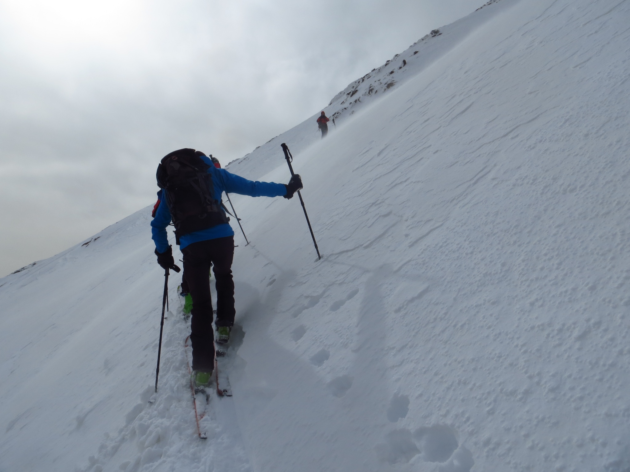 Normale Skitourenausrüstung, eventuell bei Überschreitung auch Steigeisen.