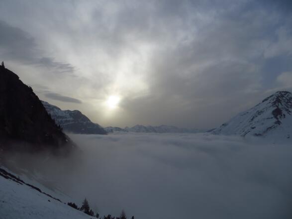 Durch die südseitige Ausrichtung der Hänge, steigende Lawinengefahr im Tagesverlauf.