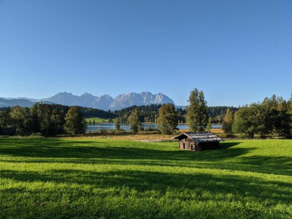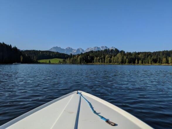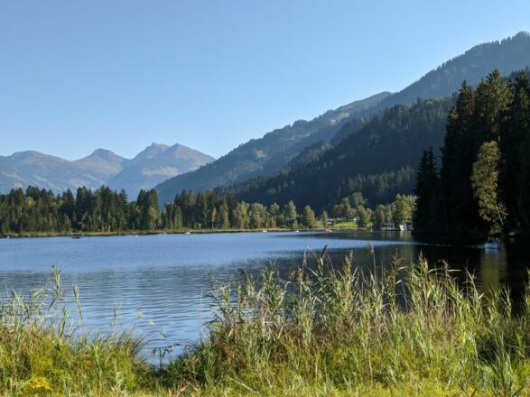 Idyllische Rundwanderung um den Schwarzsee mit Blick auf den Hahnenkamm, Kitzbühel und das Kaisergebirge sowie die ganz Südkette der Kitzbüheler Bergwelt.