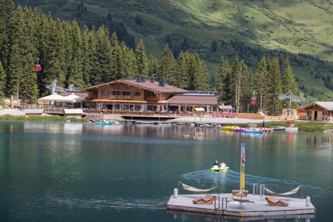 Das Bedienungsrestaurant Seealm Hög bietet mit seiner offenen Bauweise und den großen Fensterfronten einen herrlichen Blick auf den See und die umliegende Bergwelt.