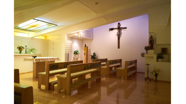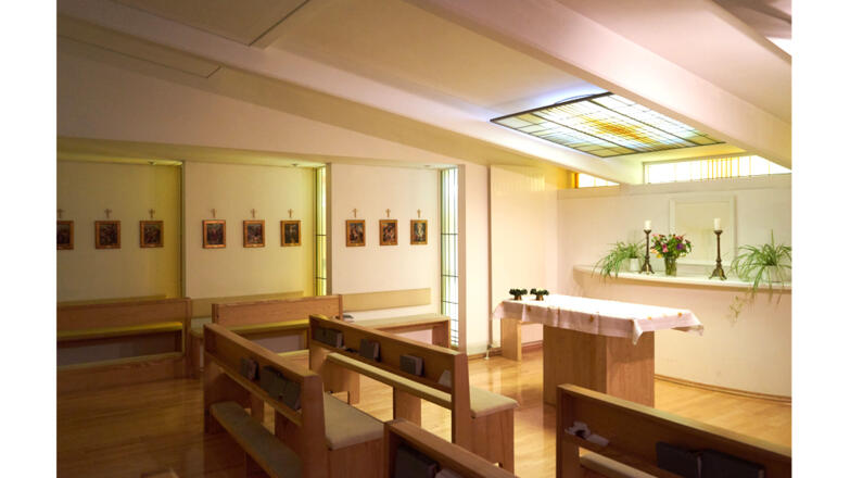 Den Bedürfnissen der Bewohner wurde auch bei der Errichtung der Kapelle großes Augenmerk geschenkt. Vor allem musste genügend Platz für Rollstühle vorhanden sein. Das große Kreuz und die Marienstatue stammen von der alten Kapelle.