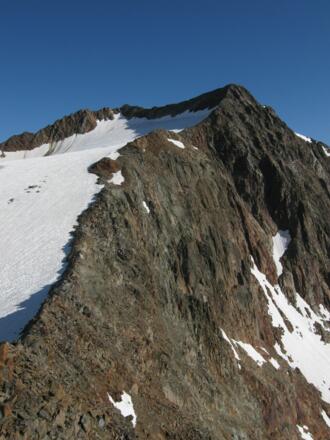 Tag 2: Zunächst geht es auf die Seescharte (2.762 m) die von der Sulzenau Hütte über den Grünausee erreicht wird. Anschließend verläuft der Weg unterhalb der Gamsspitze und führt dann über grobes Blockwerk bis zum Gletschereinstieg (ca. 3.160 m). Über den Grat geht es bis auf ca. 3.340 m, wo man ein Firnfeld erreicht. Anschließend geht es vorbei an einem steinernen Zollhäusl bis zum Grat, welcher bis zum Gipfel des Wilden Freigers führt.
