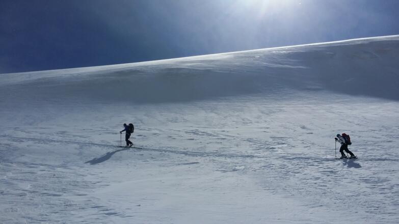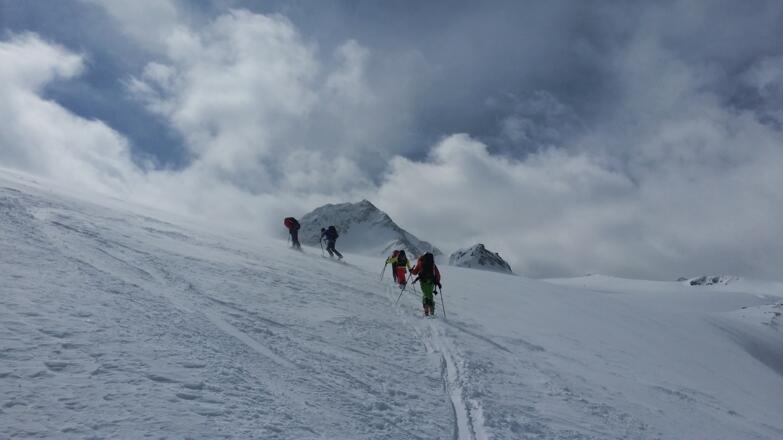 Nun in ein paar Spitzkehren steil bergauf (HARSCHEISEN empfohlen) auf den flachen Gletscher und immer der Eintiefung des Glestschers folgend zum Hauslabjoch, das sich recht mittig am Ende des Beckens befindet.
