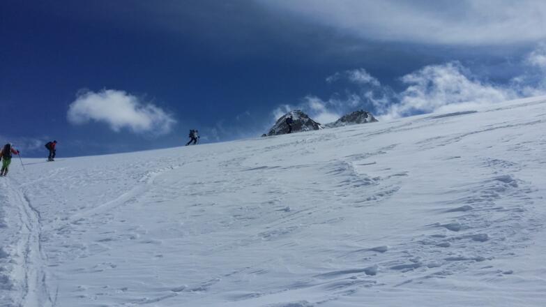 Von der Seilbahn im Skigebiet hinunter zur Talstation des Finailliftes und weiter ohne großen Höhenverlust talauswärts immer am Fuße der Abstürze und Hängegletscher bis zur Anfellstelle (ca. 2900mMh). Nun mit schwachem Höhengewinn um mehrere Felsrippen herum bis man am Fuße des steilen Hanges steht den man am besten auch wieder über die talauswärts liegende Zunge erklimmt.