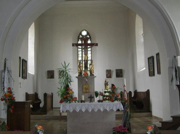 Eine der Urpfarreien der Gegend und eine der letzten Simultankirchen Bayerns in erhobener Lage mit Blick ins Ries. Wuchtiger annähernd quadratischer Westturm mit Zeltdach (um 1180). Langhaus wahrscheinlich aus dem 13. Jahrhundert, Chor Ende 15. Jahrhundert. Das gefasste Holzkruzifix aus dem frühen 13. Jahrhundert ist das älteste dieser Art im Ries.