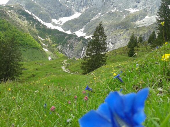 Die Wanderung selber führt euch vom Parkplatz unterhalb der Bushaltestelle über den Weg Nr. 86 zur unbewirtschafteten Lettenalm. Hier genießt ihr erstmalig den herrlichen Ausblick auf die angrezende massive Bergwelt. Der breite Weg schlängelt sich bis zur Riedingalm, die zum gemütlichen Verweilen und zur Stärkung einlädt. Hinter der Riedingalm geht es auf einem breiten Karrenweg weiter in Richtung Riedingtal. Achtung: Den Wegweiser an der linken Wegseite nicht übersehen, ab hier führt ein schmalerer Pfad ins Riedingtal. Bevor ihr dort ankommt, genießen ihr noch die Ausblicke auf die ehemaligen Sprungschanzen des Sprungzentrums Riedingtal, das in den 1970er Jahren unter der Traineraufsicht von Josef "Bubi" Bradl von internationalen Skisprungstars zum Training, aber auch für Wettkämpfe genützt worden ist.