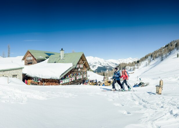 Abfahrt in der Nähe der Aufstiegsspur (bei sicheren Verhältnissen auch über den Osthang) zur Südwiener Hütte 1802 m. Die letzten 2 flachen Kilometer verlangen einen schnellen Ski oder entsprechende Schiebetechnik.