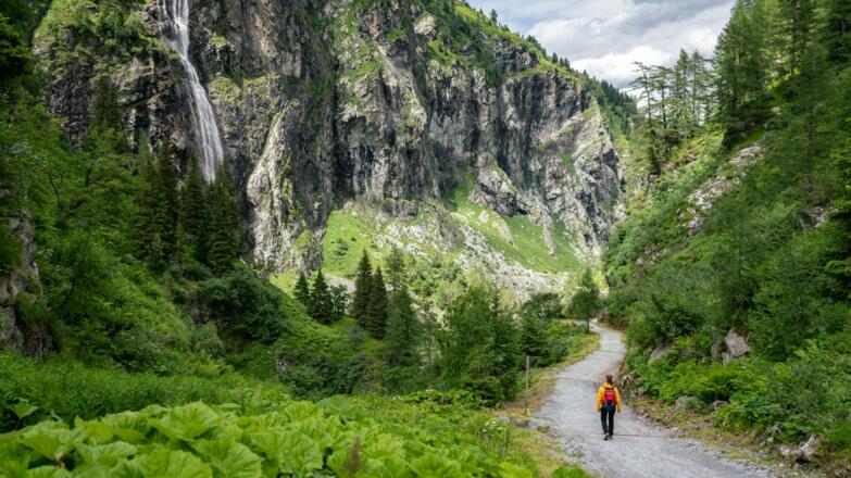 Ein Blick auf den Talboden Sportgasteins und die Hohe Tauern - die Wanderung startet. Entlang des Zwei-Farben-Flusses führt der Weg vorbei an Speicherkavernen bis zum Kraftwerk Nassfeld. Von dort aus leitet eine alte Trasse – die alte Nassfeldstraße, einst wichtig für Handel und Bergbau, in Richtung Böckstein. Der Weg ist gesäumt von vielen Naturattraktionen – der Bärenfall, Schleierfall und Kesselfall tosen mächtig von den Bergen herab. Nicht nur die Geschichte des Bergbaues wird entlang des Weges deutlich, sondern auch Relikte aus dem Ersten Weltkrieg – die „Russen Brücke“ wurde zu Zeiten des Ersten Weltkrieges von russischen Kriegsgefangenen gebaut. Die beiden Astenalmen (bewirtschaftet) gehören zu den ältesten des Gasteinertales und laden zum Einkehren ein. Der Themenweg des Gasteiner Heilstollens führt vorbei an einer einstigen Schmelzhütte und dem Pulverturm von Altböckstein nach Böckstein. Die wunderschöne Wallfahrtskirche „Maria vom Guten Rat“, die auf einer Anhöhe gelegen ist, bietet einen optimalen Blick auf die geplante Stadt Böckstein.