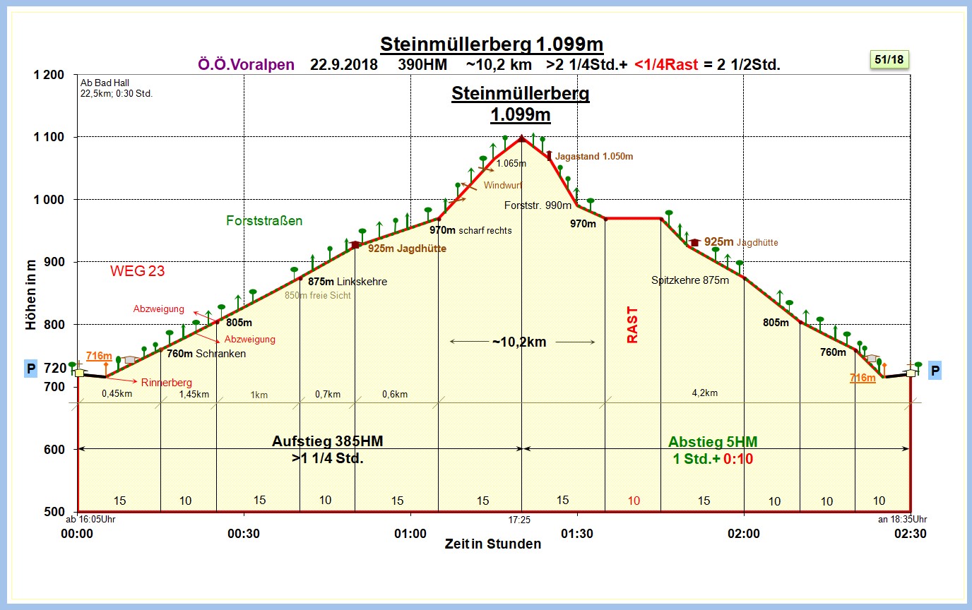 Wir folgen der Forststraße passieren zwei Wegabzweigungen (~785 m und ~805 m) und erreichen eine Spitzkehre um 875 m. Links weiter bergan und zu einer Jagdhütte (925 m). Um 970 m führt scharf rechts ein Forstweg ab, dem wir folgen. Er endet und wir steigen kurz weglos den steilen Hang hinauf, bis wir einen Forstweg um 1065 m erreichen. Links am Forstweg bis zum Gipfel vom Steinmüllerberg (1099 m) ansteigen. Gut 1 1/4 Std. und 385 HM.