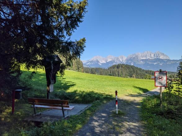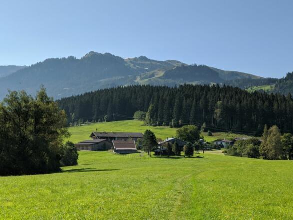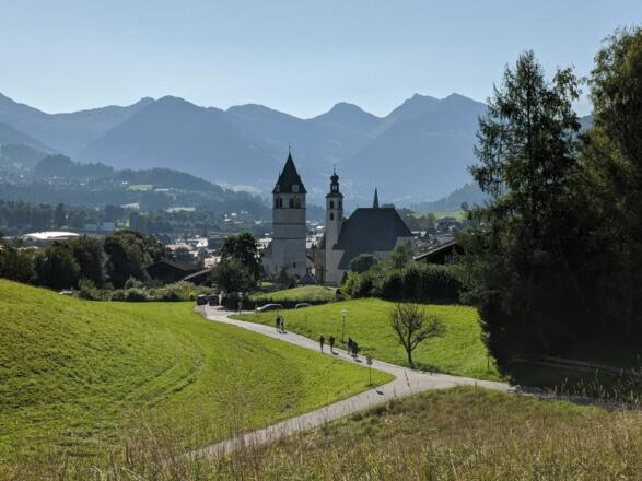 Wir starten unsere Wanderung beim gebührenfreien Parkplatz Pfarrau. Stadteinwärts folgen wir der Beschilderung bis zum Pfarrhof (nähe Kirche), wir halten uns in Richtung Lebenberg. Über zwei kleine Steigungen erreichen wir das Hotel Schloß Lebenberg. Auf diesem Weg dorthin sollte man sich öfters die Zeit nehmen, kurz stehen zu bleiben und seinen Blick Richtung Süden schweifen lassen – Kitzbühel und seine Südberge verzaubern den Wanderer. Weiter führt uns der Wanderweg Richtung Steuerberg über leicht hügeliges Gelände. Am Steuerberg kann man sich im Gasthof Steuerberg kulinarisch verwöhnen lassen – der große Gastgarten lädt ein. Um zum Ausgangspunkt wieder zurück zu gelangen folgen wir der Beschilderung Richtung Schwarzsee, Alpenhotel, Kitzbühel Pfarrau Parkplatz.