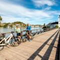 Radler am Fluss Pegnitz, Blick auf Felsen, Kanufahrer und Fachwerkhäuser