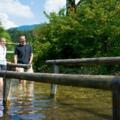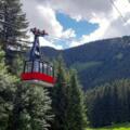 Mädchen in Skiausrüstung springt über eine Sprungschanze.