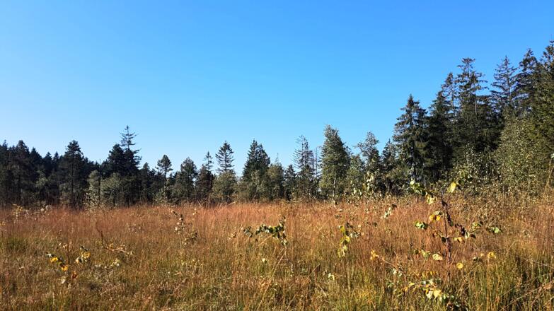 Der schattige Waldweg zieht sich am Rande einer noch ungestört natürlich erhaltenen Moorlandschaft hin mit dem zugänglichen Wildrosemoos. Beim dortigen Wegweiser lohnt es sich, auf dem eigens angelegten Hackschnitzelweg einen Abstecher ins Moor zu machen.
