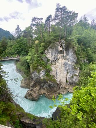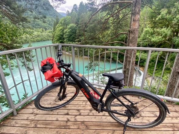 Sabine fährt mit dem Rad vom Festspielhaus am Forggensee los und Klaus setzt das WoMo zum Bhf. Reutte um. Ich schaue mir den Lechfall mit der Statue von König Maximilian an. Der neuer Radweg führt am "Grenztunnel" vorbei. Kurz nach der Brücke lässt es sich auf einer Kiesbank schön baden. Später geht es eine leichte Steigung hinauf und wieder runter zum Bhf. Reutte.