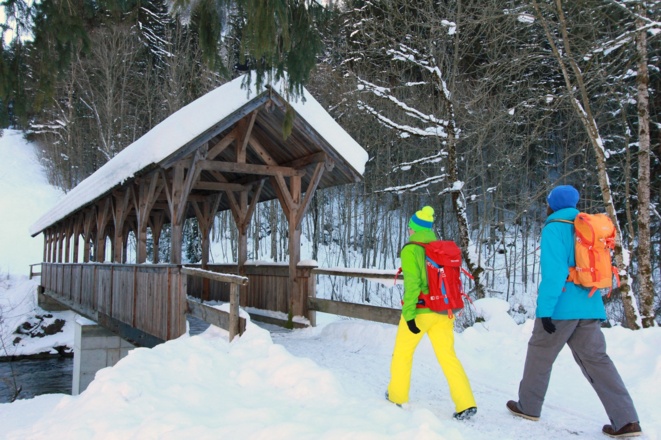 Nur kurz führt die Strecke durchs quirlige Pfronten-Ried, schon ist das Ufer der Vils erreicht und ihr wandert flussaufwärts durch den ruhigen Kurpark. Am Nordhang des Kienbergs führt der geräumte Weg, immer am Fluss entlang, immer einsamer. An der historischen Schochersäge steht heute ein modernes Turbinenhaus – über eine Brücke wechselt ihr hier die Fluss-Seite. Nun ist das Ziel schon nah: In der Vilstalsäge (Ruhetag: Montag + Dienstag) könnt ihr euch wunderbar aufwärmen und einkehren. Zurück geht es auf gleicher Strecke. Wöchentlich werden abends geführte Fackelwanderungen mit Wildtierfütterung in das idyllische Tal angeboten – ein Wintererlebnis der besonderen Art!