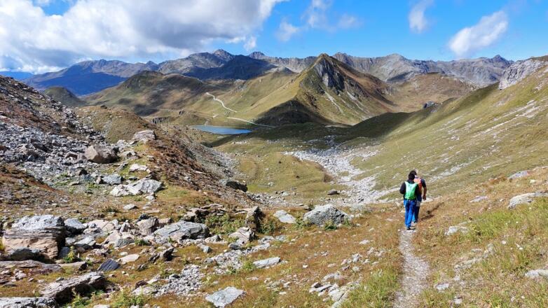 Wir folgen wiederum dem Wegweiser "Lizumer Sonnenspitze" (Tarntaler Scharte und Tarntaler Köpfe sind nicht angeschrieben), überqueren den Bach und die große Grasfläche am Fuße des mächtigen und steilen Grashangs Richtung Tarntal. Der kaum und teilweise gar nicht sichtbare Steig ist ein klares Indiz, dass diese Route selten begangen wird. Dort wo sich der Hang dann aufsteilt, ist der Steig wieder deutlicher sichtbar und auch Markierungen sind durchgängig vorhanden, sodass die Orientierung letztlich kein großes Problem darstellt. In Serpentinen geht es über den nach oben hin steiler werdenden Hang (ohne Absturzgefahr), den wir dann nach rechts verlassen. Durch einen markanten Geländeeinschnitt erreichen wir - nun überwiegt Schottergelände - das Tarntal (ebenfalls ein Naturjuwel mit kleinen Seen!), das von der Lizumer Sonnenspitze im Süden und den Tarntaler Köpfen im Norden begrenzt wird. Am orografisch rechten (nördlichen) Talrand führt der Steig unschwierig weiter zur Tarntaler Scharte (2600 m).