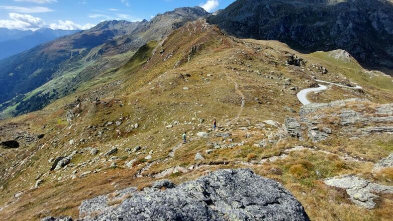 Wir folgen der Militärstraße ca. 3 km in westlicher Richtung, dabei noch einmal knapp 100 Hm aufsteigend, Richtung Mölsjoch und Naviser Sonnenspitz. Kurz vor dem Mölsjoch verlassen wir die Schotterstraße und auf schmalem Steig geht es über den sanften Rücken des Mölsjochs. Beim ersten steilen Aufschwung zweigt nun - sehr unuffällig (!) - ein Steiglein ab, über das wir nach links traversieren und um einen Rücken herum auf die Naviser Seite bzw. die Südwestseite der Naviser Sonnenspitze wechseln. Das gesamte Naviser Tal liegt nun vor uns und fast der gesamte Rückweg ist gut einsehbar. Etwas Aufmerksamkeit fordert noch das Wegfinden hinab zur Grafmartalm (kein Ausschank, aber Brunnen). Von dort geht es auf breitem Almweg hinab zur Zehenteralm (Ausschank, Brunnen), weiter zur Peeralm (Gastbetrieb) und zurück zum Parkplatz.