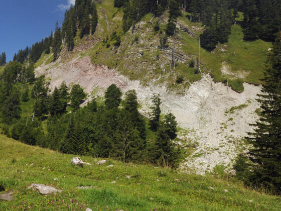 Unterhalb der Wildriesalpe führt die Rutschung am Rindberg nochmals die Dynamik der Bergwelt vor Augen. Von dort geht es zurück nach Sibratsgfäll.