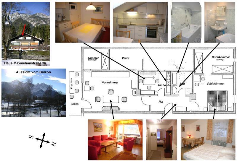Von München kommend: nach dem Tunnel in Richtung Garmisch. Burgstraße bei der 1. Ampel rechts in die Loisachstraße, mündend in die Maximilianstraße, rechts bis Eingang Ritter von Halt-Stadion, gegenüber Maximilianstr. 36 Die Wohnung liegt im 2 Stock eines Hauses mit 7 Wohnungen. Ruhige Lage, 2 gleich aussehende Häuser im zurückliegenden Haus. Dachgeschoßweohnung - Mansardenwohnung). Gegenüber liegt ein Sportplatz (Ritter von Halt-Stadion), deshalb excellente Bergsicht vom Karwendel bis Zugspitze. Direkt neben dem Haus beginnt der Aufstieg zum Kramerplateauweg. Zum Marienplatz geht zu Fuß in 10 Minuten. Einkaufsmöglichkeit 10 Minuten zu Fuß zum Tengelmann-Markt in der Zugspitzstraße. Auto-Stellplatz in ebenerdiger Garage mit Zugang zum Haus. Zur kostenlosen Verfügung stehen 2 Fahrräder und eine Waschmaschine (im Waschraum neben dem beheizten Trockenraum). Schlüsselübergabe + Info vor Ort: Frau Bartl, Tel. 0171-4515050