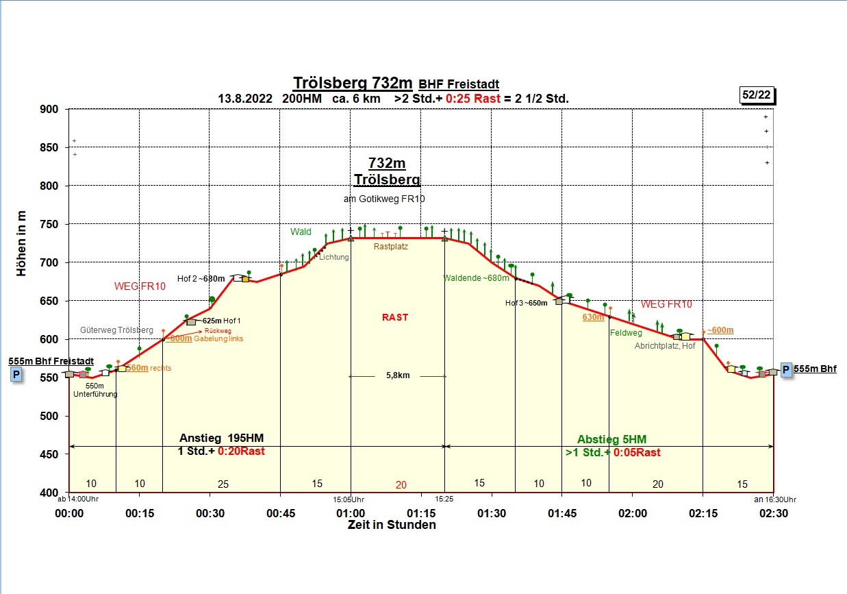 ANSTIEG: Vom Bhf Freistadt auf die L1498 (Hirschbachstraße) gut 80 m folgen und links schräg abbiegen. Nach gut 300 m ab Bhf links durch die Bahn und bald rechts ab, (Wegtafel 560 m, GH Straßeder, Trölsberg) und dem Güterweg Trölsberg leicht steigend folgen. Bei der Gabelung wieder mit Wegtafel (600 m Trölsberg, Marreith) links haltend bergan. Beim zweiten Hof zur Rechten um 680 m kurz vorbei. Nach >100 m aufpassen, es geht rechts ein Pfad im Wald ab (kleine, gelbe Tafel). Bei einer Lichtung ist der Pfad ev. weggeackert, am Waldrand entlang und gleich sind wir wieder im Wald. In einer Rechtsschleife gehts zum Gipfel vom Trölsberg (732 m) mit Tisch und Bankerl unterm Kreuz samt Buchkasette im schattigen Wald.