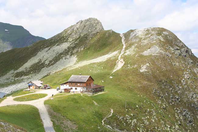 Durchs Weitental zum Tuxeriochhaus: Vom Fliesenparkplatz an der Talstation der Gletscherbahn hält man sich auf einem bezeichneten Wanderweg genau nordwärts über die Wiesen zum kleinen Weitentalbach. überquert ihn und steigt weiter über die Wiesen an, bis man auf den Weg 323 von Hintertux her trifft. Auf dem oberen Weg (323) nach links ins Weitental und zu dem eindrucksvollen Schleierfall. Nahe dem Wasserfall über die Steilstufe und in das obere Weitental. zuletzt einem Fahrweg folgend zum Tuxerjochhaus. Auf das Pfannköpfl: Dies ist ein kleiner, felsiger Aussichtsgipfel kurz nördlich über dem Tuxerjochhaus. Seine Besteigung ist nicht schwierig, erfordert aber Trittsicherheit. Von hier genießen wir einen schönen Ausblick auf die Gletscher, die von Olperer, Gefrorener-Wand-Spitze und Hohem Riffler nach Norden gegen das Tuxer Tal ziehen. Abstieg: Der Lift von der Sommerbergalm zum Tuxerjochhaus ist im Sommer nicht immer in Betrieb. Man steigt also zu Fuß dem Fahrweg folgend zur Alm ab und legt die letzte Wegstrecke per Seilbahn zurück; oder man steigt, ohne an der Sommerbergalm vorbeizukommen, direkt nach Hintertux ab. Auch von der Sommerbergalm selbst führen verschiedene Wege ins Tal. Für Bequemere empfiehlt sich die Tour in umgekehrter Richtung. wobei der Höhenunterschied im Anstieg per Seilbahn und Lift überwunden wird.