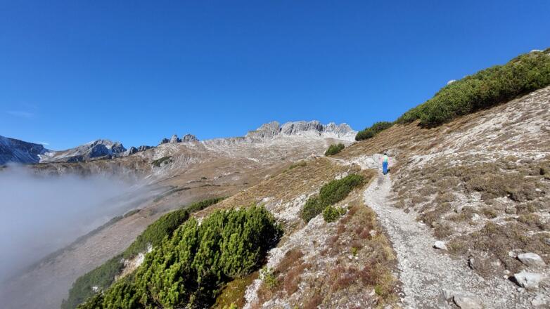 Über den Enzensbergerweg geht es nun, ohne viel Steigung, durch das Balschtekar zum Balschtesattel. Dort muss ein kleines Stück abgestiegen werden, bis man auf den Weg zum Gipfel der Roten Wand gelangt. Kurz vor dem Gipfel gibt es eine leichte, seilversicherte, Kletterstelle. Hat man diese überwunden, gelangt man über eine letzte, ebenfalls seilversichterten Querung zum Gipfel.