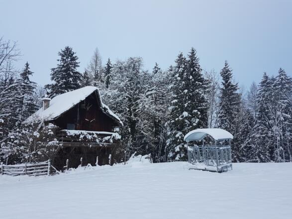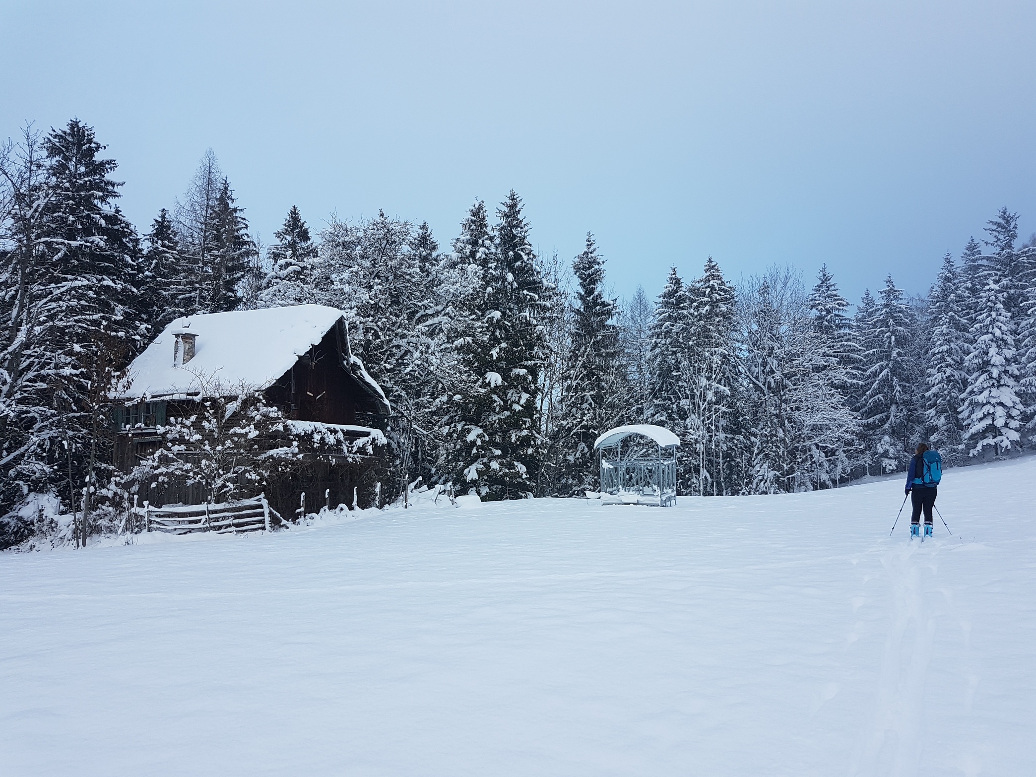 Die Abfahrt erfolgt über einen einladenden Hang. Man folgt dem linken Waldrand und biegt links ab zu einer weiteren privaten Hütte, welche man rechts liegen lässt. Nach einem kurzen Hang quert man einen Weg und hat einen weiteren Wiesenhang. Kurz vor dem Wiesenende und einem Weg, nimmt man den kurzen Pfad durch den Wald auf der linken Seite.