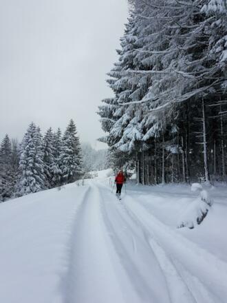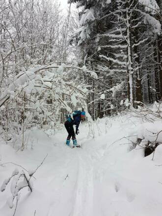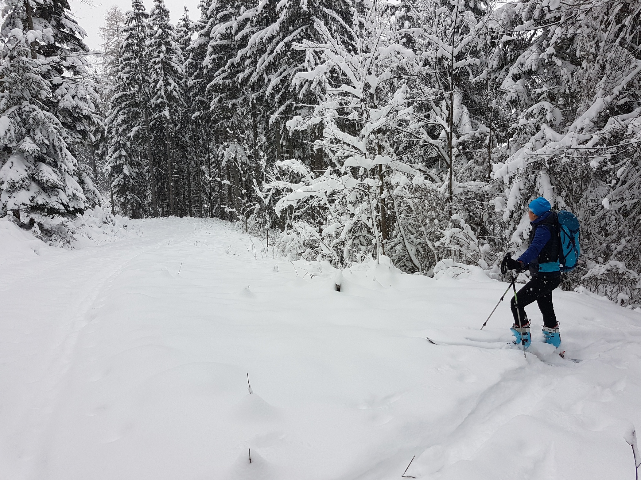 Man folgt diesem manchmal schlecht ersichtlichen Traktorweg nach oben. Quert dann rechts raus und geht dann relativ weglos dem Wald empor. Bei geringer Schneelage kann das schon etwas unangenehm sein.