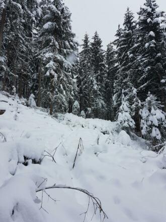 Nach Erreichen der "David-Hütte" folgt man dem Sommerweg weiter bergauf, bis kurz vor der Kreuung "Gschoad - Schieferstein". Man quert kurz links raus aus dem Wald und beenden hier unseren Aufstieg.