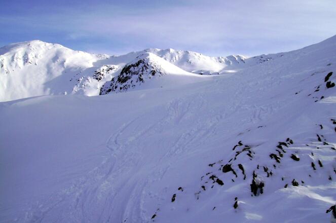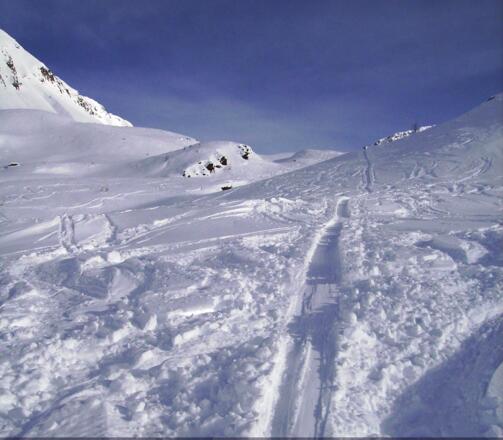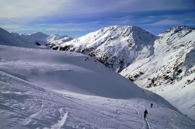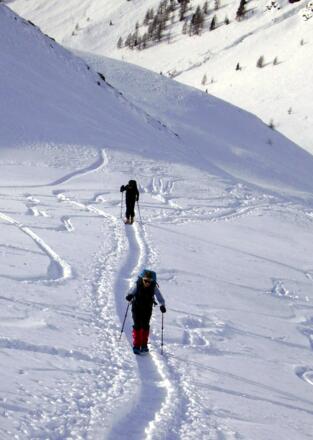Erfahrung bei der Lawinenlagebeurteilung ist unbedingt notwendig - der Aufstieg durch das Tal des Einatbaches führt unter steilen Hängen hindurch.