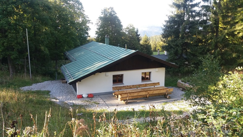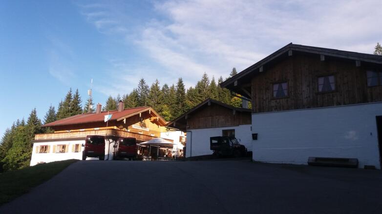 Nun bleiben wir auf den Betonplatten, die hier den Fahrweg bilden und wandern zwischen dem rechtsliegenden Demelkaser Bergwachthaus und dem links des Fahrweges liegenden Gebäude hindurch. Anschließend kommen wir an der schönen Lichtung mit der unterhalb liegenden Gschwend-Alm vorbei. Noch lange zieht sich der Betonplattenweg weiter abwärts, an einer Ruhebank vorbei, bis wir schließlich den Parkplatz in Blindau an der Haltestelle für den Fahrbetrieb erreichen.