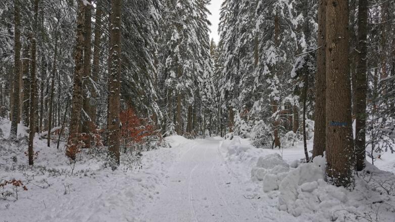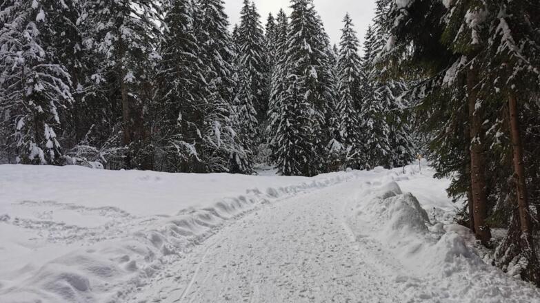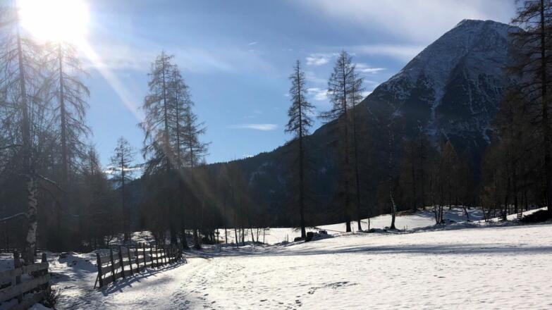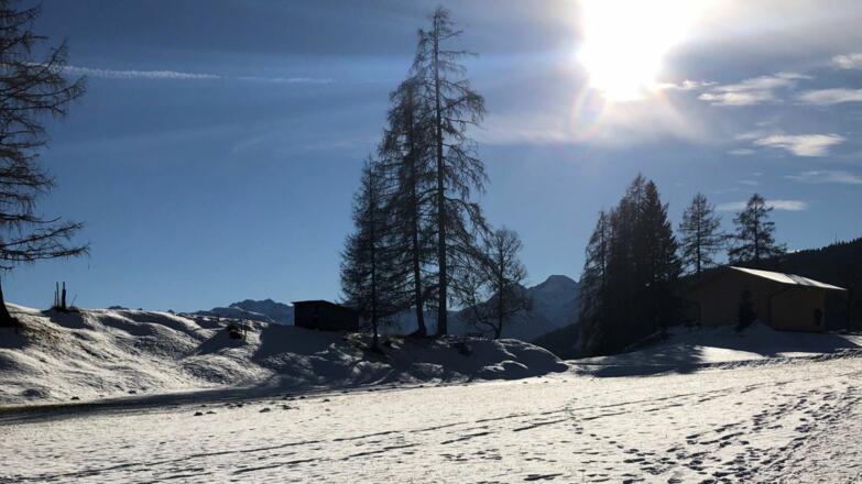 Winterliche Landschaftsrunde über verschneite Wiesen und durch lichte Lärchenwälder.