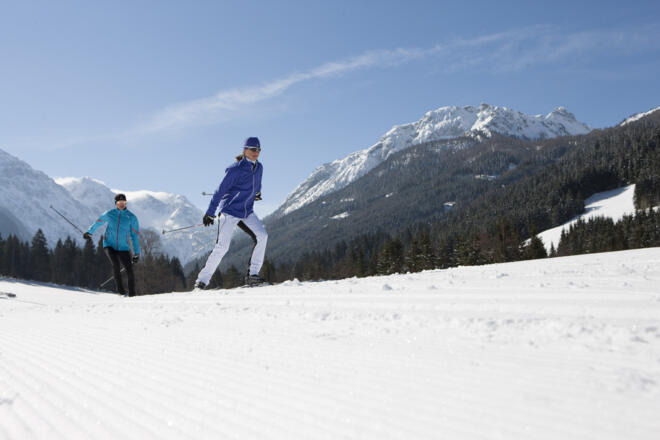Je nach Laufart Skating-Ski oder Klassik-Ski, Langlaufbindung, Langlaufschuhe und Langlaufstöcke, angenehme Kleidung zum Laufen,