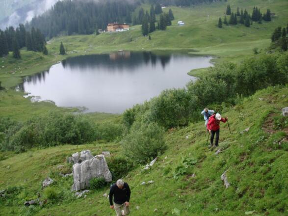 Ab dem Landsteg wandern wir entlang der Bregenzer Ache nach Unterboden und weiter Richtung Abendteuerpark. Dort steigen wir ein kurzes Stück bis ins Dorf Schröcken auf. Ab dem Hotel Mohnenfluh gehts dann über die Wilde Bregenzerach zur Alpe Felle, gleich anch der Alpe steigen wir zur Gletschermühle ab und kommen auf den Güterweg zur Alpe Batzen. An der Alpe Batzen laufen wir zum Körbersee. Rechtsseitig am Körbersee vorbei gehen wir zum Aufstieg in den Alpen Garten. Der Alpen Garten hat eine ungeheure Pflanzen - und Blumenvielfalt und wunderschöne Ausblicke zum Körbersee und der Braunarl. Wir kommen zum Salobersattel und wandern mit Sicht zum Kalbelesee Richtung Passhöhe. Der Hochtannbergpass liegt an der Europäischen Hauptwasserscheid und trennt das Wasser zum Rhein und Nordsee und ebenso zur Donau und zum schwarzen Meer. Weiter wandern wir vorbei an der Kuchelalpe und dem Krumbacher Ried mit dem krummen Bach zum Hotel Jägeralpe