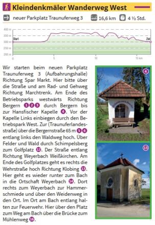 Wir starten beim neuen Parkplatz Traunuferweg 3 (Aufbahrungshalle) Richtung Spar Markt. Hier bitte über die Straße und am Rad- und Gehweg Richtung Marchtrenk. Am Ende des Betriebsparks westwärts Richtung Bergern 1 2 3 durch Bergern bis zur Hansfischer Kapelle 4 . Vor der Kapelle Links einbiegen durch den Be-triebspark West. Zur (Traunuferlandes-straße) über die Bergernstraße 65 m 5 6entlang links den Waldweg hoch. Über Felder und Wald durch Schimpelsberg zum Golfplatz 12. Der Straße entlang Richtung Weyerbach Weißkirchen. Am Ende des Golfplatzes geht es rechts die Wehrstraße hoch Richtung Klobing 13.Hier geht es wieder runter zum Bach in die Ortschaft Weyerbach 14. Dort rechts zum Weyerbach zur Hammer-schmiede und über den Weidenweg in den Ort. Im Ort am Bach entlang hal-ten zur Feuerwehr. Hier über den Platz zum Weg am Bach über die Brücke zum Mühlenweg 16.