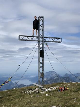 Nach dem Karstplattengelände, welches uns weitere 2 Stunden abverlangt, wird der Weg schlussendlich stetig steil. Die Abzweigung nach links zum Schönberg Ostgrat über den kleinem Wehrkogel könnten wir als Alternative wählen. Diese lassen wir jedoch aus, halten uns rechts, bis nach ca. 30 Minuten die nächste Abzweigung nach links zum Schönberg Ostgrat kommt (auf Höhe des Ahnenschachtes). Wir folgen also den Tafeln des Welser Höhenweges, der uns auf den Schönberg Ostgrat leitet. Dieser ist, unter fallweiser Zuhilfenahme der Hände, eine überaus einfache Kraxelei, die auch an den wenigen, etwas steileren Stellen drahtseilversichert ist. Etwa 45 Minuten nach der Abzweigung zum Ostgrat erreichen wir den Wildenkogel, den wir angesichts des gut besuchten Schönberggipfels (2093 m) als Gipfelplatz auserwählen. Schließlich sind wir nach dieser grandiosen Überschreitung die Ruhe bereits etwas gewöhnt :-) Wie Smaragde liegen die Seen des westlichen Salzkammergutes unter uns, und wir philosophieren über das Paradoxon der so nahen und doch so fernen Heimat. Leise pfeift der Wind, und Dohlen landen, um einen Nachmittagsschmaus zu erhaschen.