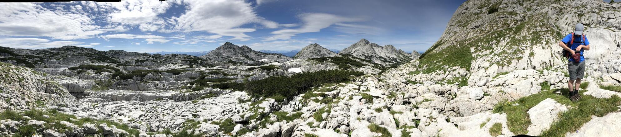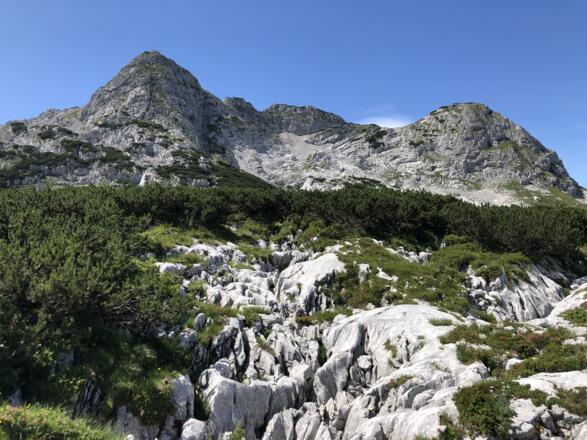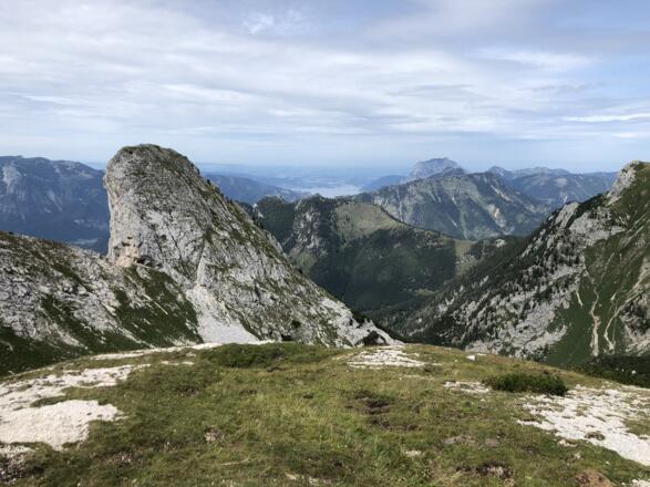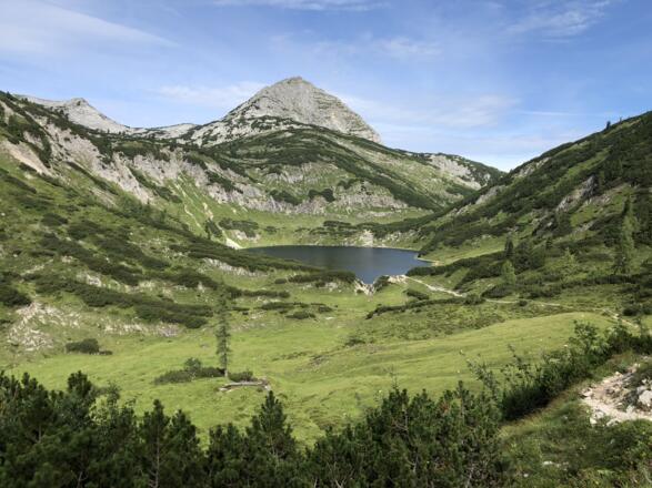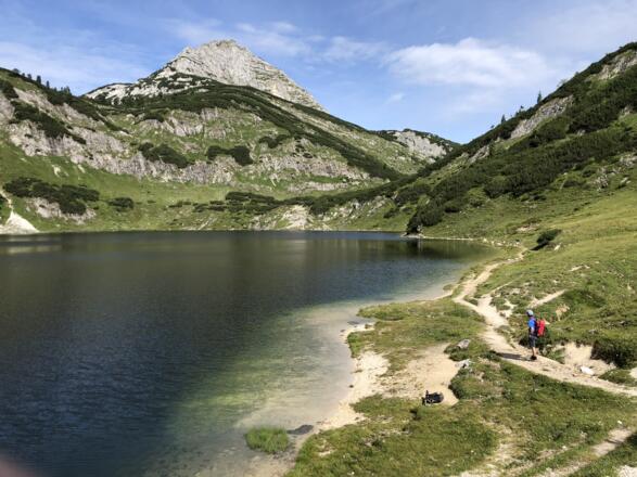 Es geht wieder in größere Höhen und kargere Gegenden. Diese Tour ist definiert durch die atemberaubende, stille Schönheit des Wildensees mit dem sich dahinter auftürmenden Rinnerkogel (1952 m), dem weiteren Verlauf über weite Karstfelder sowie dem königlichen Anstieg über den Schönberg Ostgrat auf den Wildenkogel / Schönberg, der einen Rückblick über die gesamte hinter uns liegende Tour bietet, und langsam den morgigen Abstieg ins Rettenbachtal einläutet. Bad Ischl lässt sich bereits erahnen, die blauen Seen des Salzkammergutes liegen wie Saphire unter uns.