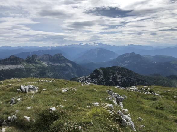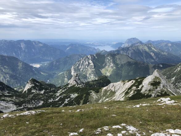 Wir orientieren uns nun an den Felsmarkierungen auf dem immer plattiger werdenden Gelände. Der Blick in das nördliche Salzkammergut ist weit, schon erkennen wir erstmals wieder die Heimat, in den uns am nächsten Tag der Zug wieder bringen wird.