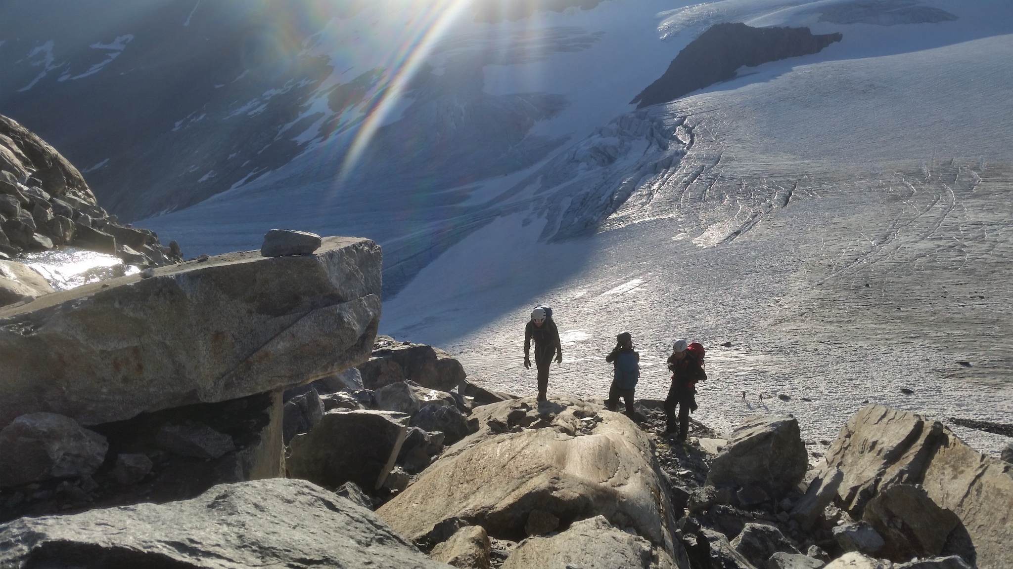 Anstatt über den ausgeaperten Gletscher zu laufen, kann alternativ auch über grobes Blockwerk gegangen werden.