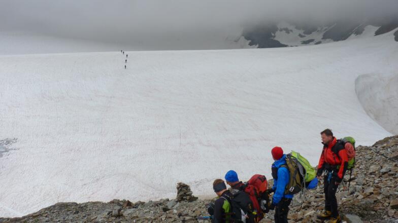 Gletscherausrüstung: Steigeisen, Pickel, Gurt, Karabiner, Seil, Gletscherbrille, Erste Hilfe Set, Helm, Stirnlampe, Kleidung für jede Wetterlage, Wechselkleidung,