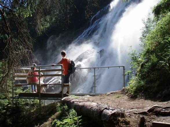 Recht unvermittelt öffnet sich nach einer Wegbiegung der Blick durch die Bäume auf den imposanten Grawa Wasserfall, dem Herzstück des WildeWasserWeges. Breitester Wasserfall der Ostalpen und Naturdenkmal – die Superlative reichen sicher nicht aus, um die wilde Schönheit dieses Wasserfalls zu beschreiben. Je nach Wassermenge verändert der Grawa sein Erscheinungsbild entscheidend. Im Spätherbst sehen wir nur einen eher spärlichen Streifen im rechten Teil. Im Frühsommer bei der Schneeschmelze und insbesondere nach starken Regenfällen zerteilt sich der Wasserschwall oberhalb der Fallstufe auf eine breite Fläche. Treppenartige Kaskaden, wehende Wasserschleier, tosende und gischtende Wasserschwälle – all das kann hier beobachtet werden.