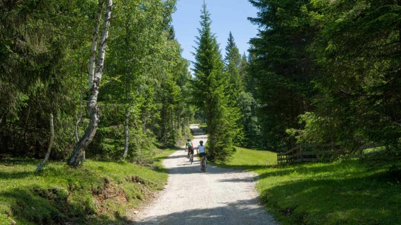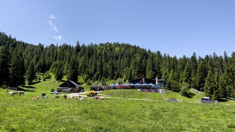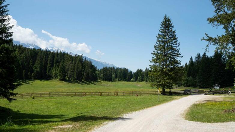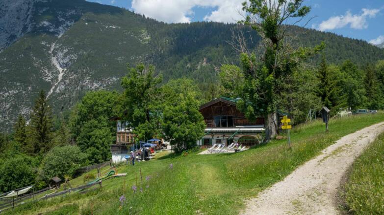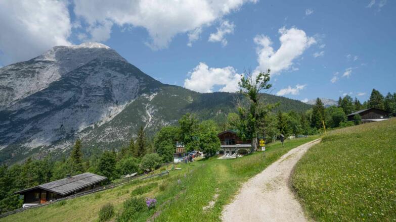 Gestartet wird auf 1.300 m bei der Wildmoosalm in Seefeld. Links der breiten Forststraße entlang bis zur Kreuzung. Hier halten Sie sich wieder links Richtung Ferienheim Wildmoos und Buchen. Stets auf einer breiten Forststraße bleibend kommen Sie beim Ferienheim Wildmoos vorbei. Wenn Sie Glück haben und es ein schneereicher Winter war, können Sie hier ein Naturschauspiel bewundern - den Wildmoossee. Dieses a-periodische (nicht regelmäßig) auftretende „Naturwunder“ ergibt sich wahrscheinlich aus einem Zusammenspiel des Wasserstandes in den unterirdischen Karstsystemen aufgrund des Frühjahrsniederschlages und der Schneeschmelze. Weiter geht es auf dem Forstweg, vom Golfplatz Seefeld-Wildmoos vorbei bis zur nächsten Abzweigung. Hier wieder links halten Richtung Buchen Ropferstub'm. Bei der Ropferstub'm erwartet Sie eine großzügige Sonnenterrasse mit dem wohl schönsten Blick auf das Inntal (bei klarer Sicht sogar bis zum Arlberg). Genießen und stärken Sie sich mit Spezialitäten wie einem Heidelbeerschmarren, Strudel & mehr.