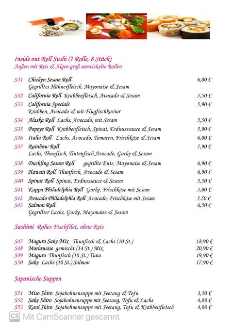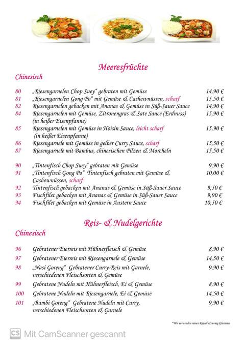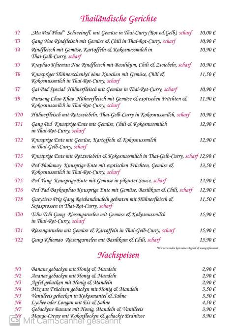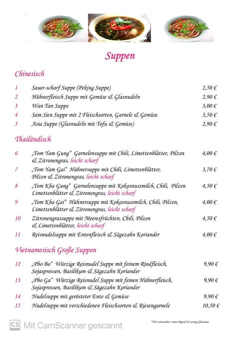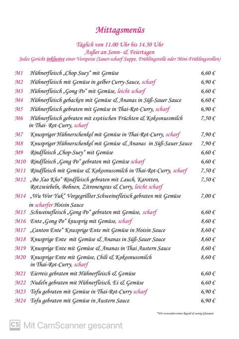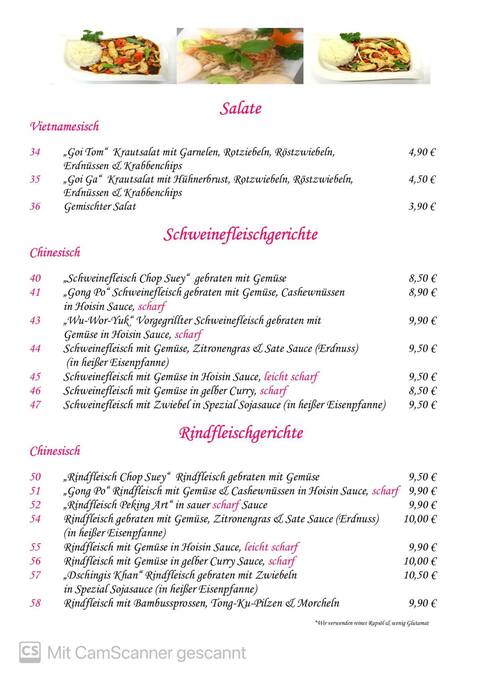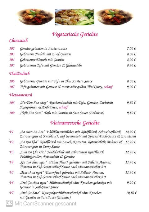 Die Karte ist in Chinesisch, Vietnamesisch und Thailändisch gegliedert. Dies Speisen sind je nachdem scharf oder mild und sehr lecker. Auch Sushi wird angeboten. Immer frisch immer lecker.