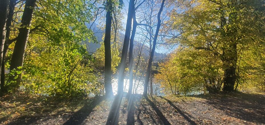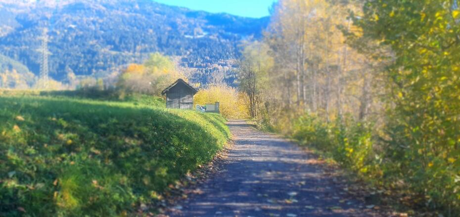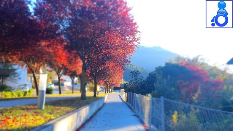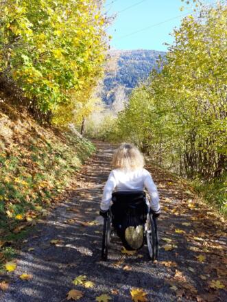 Tour mit Rollstuhl, leicht und teilweise mittelschwer befahrbar. Kompakter Boden Untergrund mit Kies, ohne seitliche Gefälle.