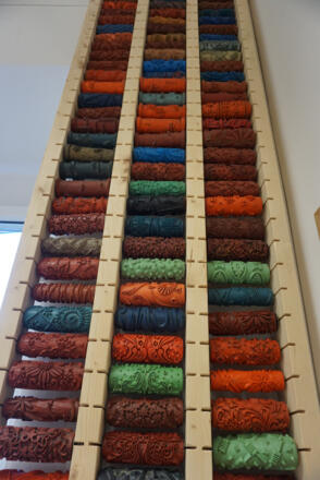 In der Zeugfärberei stehen zwei Indigoküpen, außerdem gibt es die Möglichkeit zum Färben mit Naturfarbstoffen oder Reaktivfarben. Den Drucktisch nutzen wir hauptsächlich zum Siebdrucken, weil wir nur ein paar Handdruckmodel haben. Gedruckt wird mit dem traditionellen Papp (der Reserve-Paste für die Indigofärberei), oder mit Textilfarben auf Stoffe und fertige Stücke.