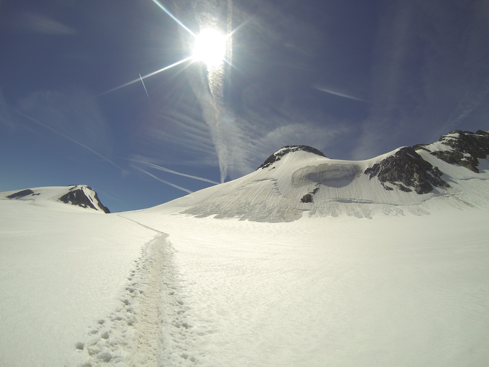 Wir steigen von der Bergstation am Isidornieder über den Gaiskarferner Richtung Süosten bis auf eine Höhe von 3.050 m ab. Nun geht’s wieder aufwärts zur bereits sichtbaren Bergstation am Fernaujoch. An der Station vorbei und über den Grat Richtung Osten auf guten Steigspuren bis auf eine Höhe von 3200 m aufsteigen. Ein großer Steinman weißt uns den Weg nach rechts. Über das Steiglein (oft mit Schnee gefüllt und daher die Schlüsselstelle des Grates) queren wir hinüber auf die Südschulter unterhalb vom Punkt 3.273 m (AV-Karte Stubaier Alpen 31/1). Nun queren wir unterhalb des Grates hinüber zum Pfaffenjoch 3.212 m. Auf der Nordseite des Zuckerhütl hinüber zum Pfaffensattel auf 3.332 m. Nun über den Ostgrat aufwärts bis wir die Felsen des Gipfelaufbaues erreichen. Nun ist Trittsicherheit gefragt UIAA II. Eisenbügel erleichtern den Aufstieg auf das Zuckerhütl 3.507 m. Auf dem gleichen Weg steigen wir wieder zum Pfaffensattel ab und weiter über das Pfaffenjoch zum Fernaujoch. An geeigneter Stelle steigen wir über den Fernauferner entlang der Seilbahnstützen hinunter zur Mittelstation der Eisgratbahn. Hier befindet sich auch die Dresdnerhütte.