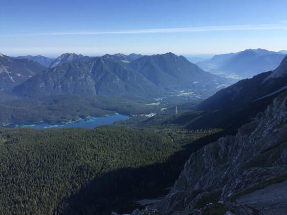 Vom Parkplatz der Schipiste folgen und dann den Weg weiter vorbei an der alten Zugspitz Mittelstation bis zur Wiener Neustätterhütte. Nach der Hütte noch ca. 20 Minuten bis zum Klettersteig Einstieg. Der Klettersteig ist relativ einfach, allerdings auf loses Gestein achten. Nach dem Klettersteig sind es noch ca. 50 Minuten bis zur Bergstation der 3 Seilbahnen. Von dort ist auch der Zugang zum letzten "Mini"-Stück zum Gipfel.