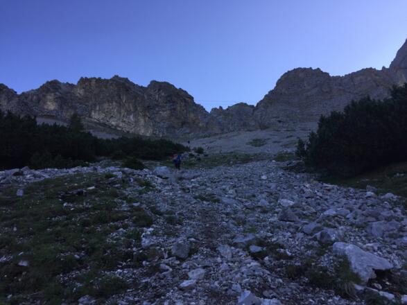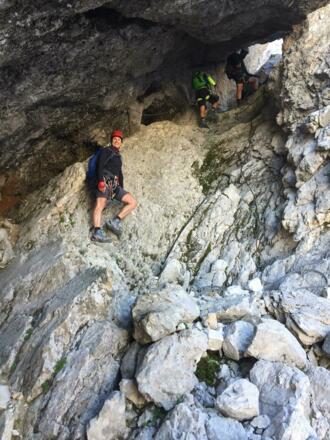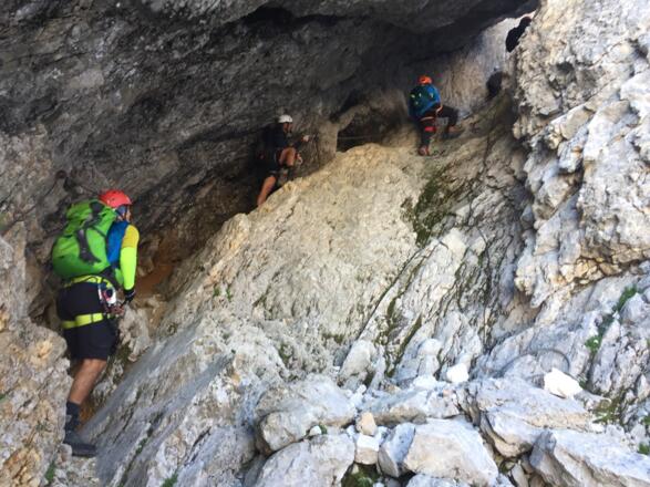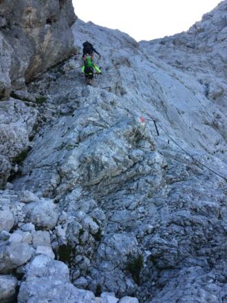 Wanderausrüstung, gutes Schuhwerk. Erfahrene Bergsteiger benötigen keine Klettersteigausrüstung. Helm ist wichtig, weil loses Gestein.